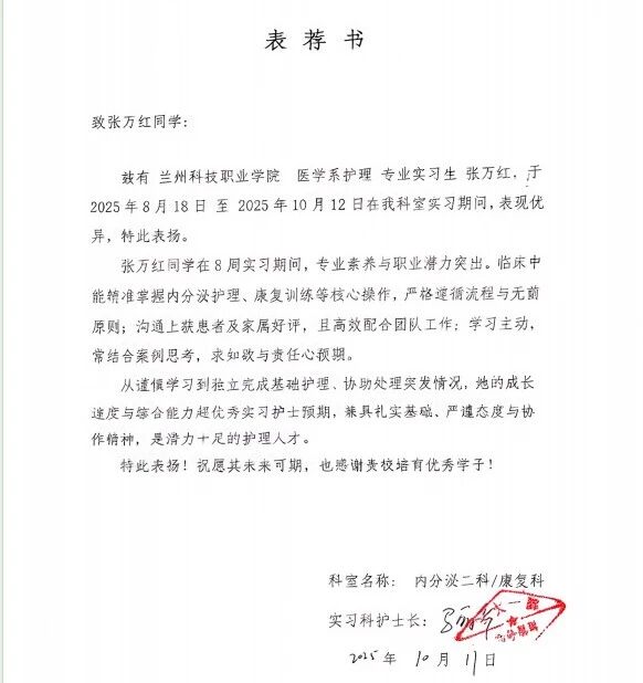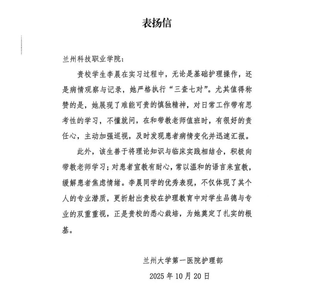 近日,我院两名护理专业实习生李晨、张万红在兰州大学第一医院多个科室实习期间表现优异,先后收到医院护理部、实习科室及患者家属的书面表扬。她们在普外科、内分泌科、康复科等不同岗位的扎实表现,展现出我院学子全面的专业素养与持续的成长轨迹。